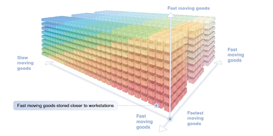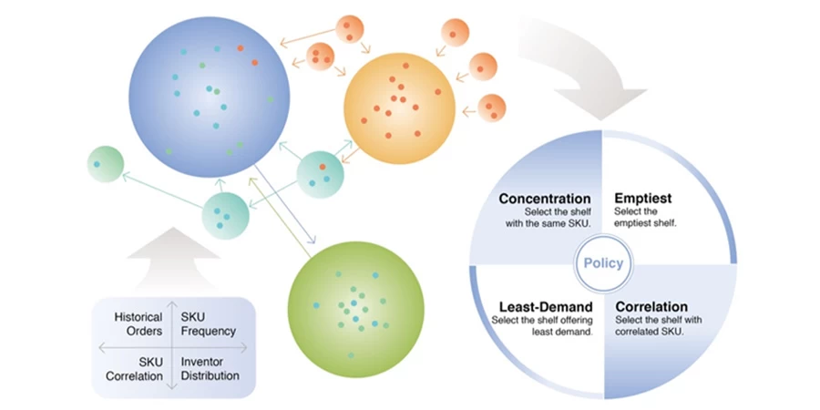 基于海量的历史订单数据,对未来的订单需求进行预测,active(定期的)和passive(实时的)热度移位相结合,将货架放到最合理的位置,最小化拣货作业时整体货架搬运距离。从“一仓一策”到“一品一策”,从“一车一策”到“一行一策”,最大化入库、出库效率。