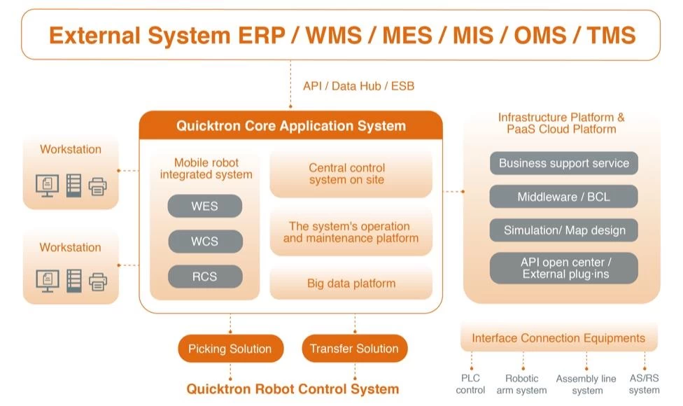如果客户拥有自己的仓储系统并且可以管理库存和存储对齐,Quicktron 会单独提供机器人控制系统 (RCS)。 RCS 与客户的仓储系统无缝集成,Quicktron 的 RCS 只专注于根据从客户系统收到的指令进行机器人运动